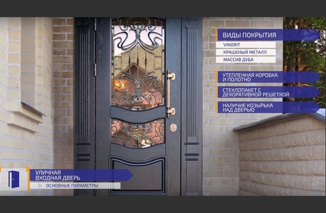 • Множество вариантов оформления. Двери со стеклом и ковкой выглядят изысканно и презентабельно, деревянный массив придаёт фасаду здания величественности.